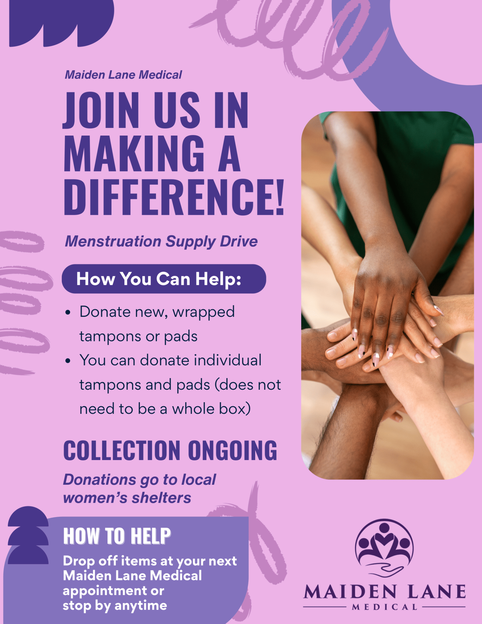 Patients and community members can drop off unopened menstrual products at any of the seven Maiden Lane Medical facilities during regular business hours. Donations are collected and delivered directly to NYC homeless shelters and community support organizations serving women and families in need.